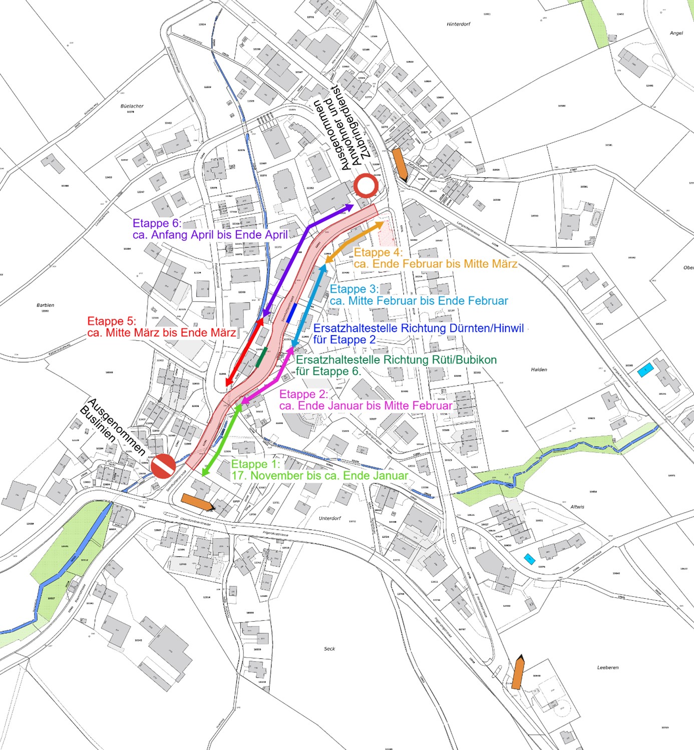 Während sämtlicher Etappen wird die Sennhüttenstrasse mit einer Lichtsignalanlage gesteuert. Für die Bauzeit besteht ein Fahrverbot im Abschnitt Sennhüttenstrasse. Ausgenommen ist der Linienbusverkehr. Den Anwohnerinnen und Anwohnern ist es gestattet, über die Hinwilerstrasse zuzufahren. Die Umleitungen in Rüti und in der Breitenmatt führen über die Hinwilerstrasse. Der Veloverkehr wird gleichenorts wie der motorisierte Verkehr umgeleitet.